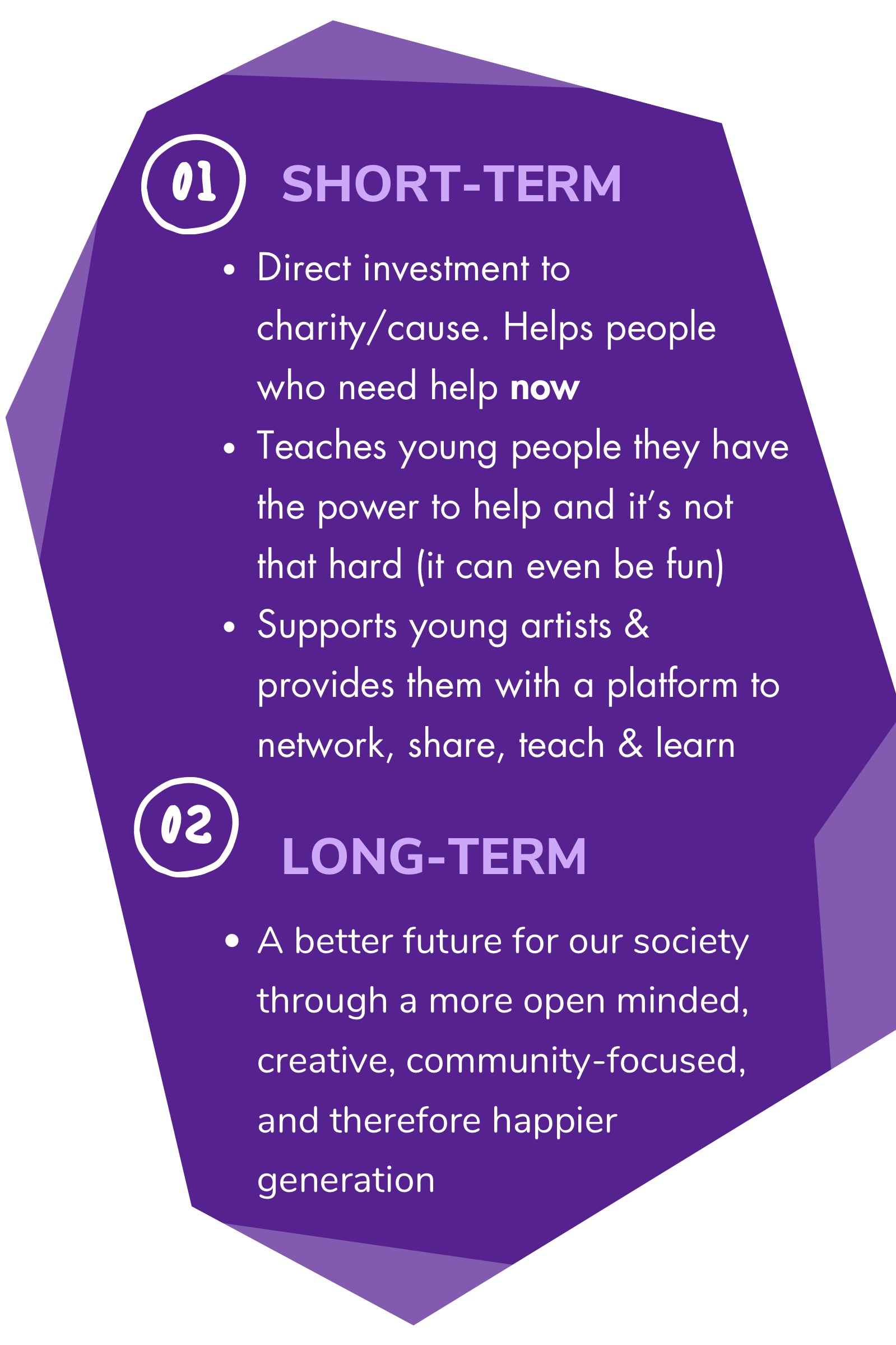 Solve all social issues by solving the underlying problems: lack of empathy and lack of community. Executed through multidisciplinary youth artistic showcase-fundraisers.